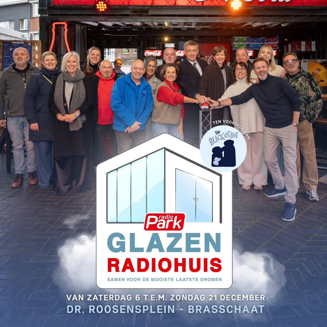 Van 6 tot en met 21 december 2025 verwarmde Radio Park Brasschaat opnieuw met het Glazen Radiohuis. 16 Dagen lang stond hun glazen studio in het teken van hoop, verbondenheid en bijzondere verhalen. Dit jaar zette ze hun schouders onder het thema: “Samen voor de mooiste laatste dromen”.